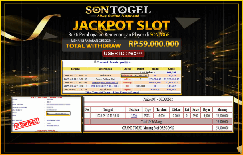 BUKTI JP SONTOGEL – Situs Togel Online, Live Casino dan Slot Online Terpercaya yang terbukti membayar berapapun kemenangan Anda tanpa kekurangan sepeserpun. Jika Anda masih mencari Situs Terpercaya, jangan ragu untuk bermain di SONTOGEL. Dalam 1 akun Anda bisa menikmati semua permainan dengan minimal deposit hanya Rp. 5.000,- saja.