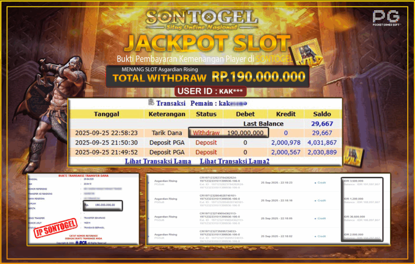 Selamat Kepada Member SONTOGEL dengan USER ID : KAK*** SLOT ASGARDIAN RISING di provider PG Soft sebesar RP.190.000.000,- LUNAS langsung di transfer ke rekening member tanpa kurang sepeserpun. Terimakasih telah mempercayakan SONTOGEL sebagai Situs Online Terpercaya dan Aman! Jangan tunggu tunggu lagi! langsung saja daftarkan akun bermain di SONTOGEL dan dapatkan bonus berlimpah setiap minggunya.