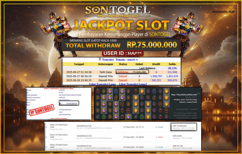 Selamat Kepada Member SONTOGEL dengan USER ID : SUU*** SLOT GATOT KACA 1000 di Pragmatic Play sebesar RP.75.000.000,- LUNAS langsung di transfer ke rekening member tanpa kurang sepeserpun. Terimakasih telah mempercayakan SONTOGEL sebagai Situs Online Terpercaya dan Aman! Jangan tunggu tunggu lagi! langsung saja daftarkan akun bermain di SONTOGEL dan dapatkan bonus berlimpah setiap minggunya.